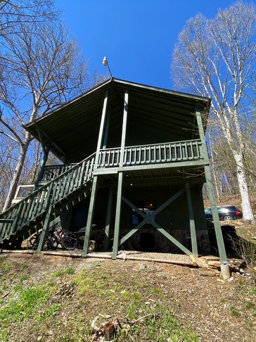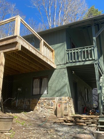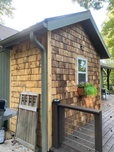 Master bath addition built out over a portion of the deck, nearly complete with cedar shake siding and black metal roof