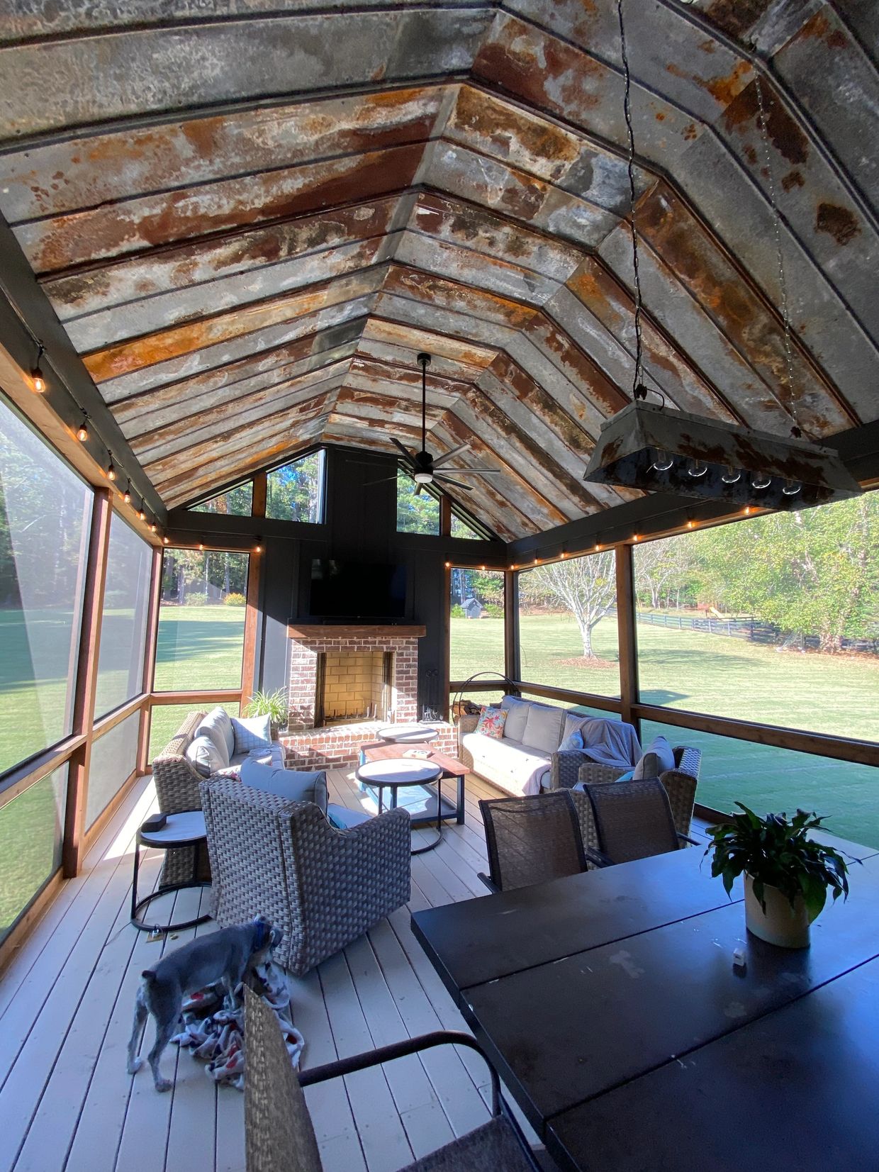Authentic rusted metal roofing for ceiling, good view of screen-tite track system for screens.