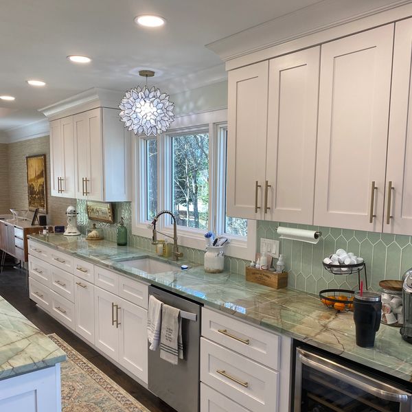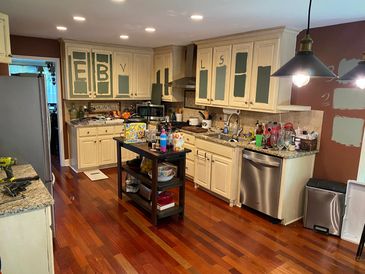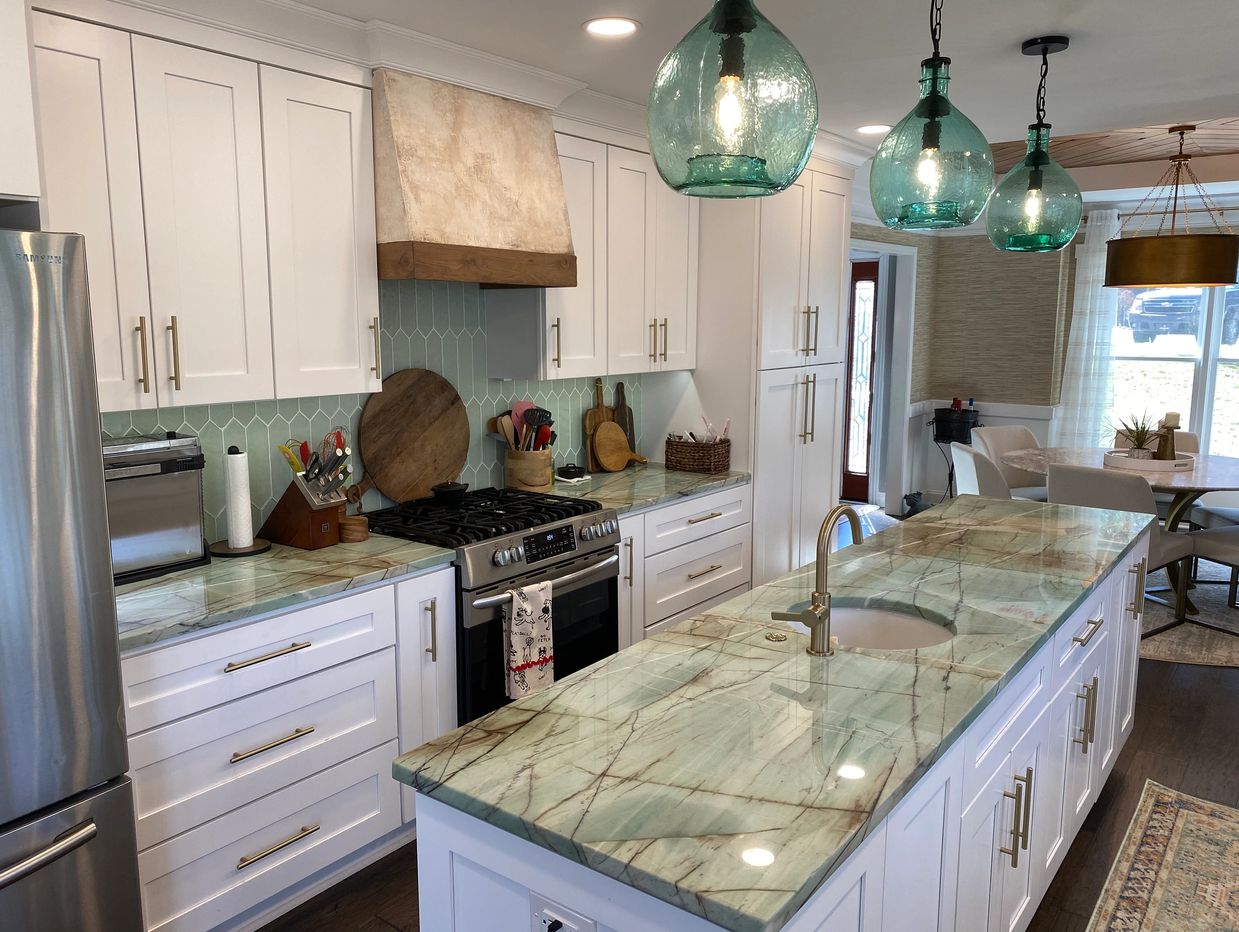 Weeks later, all new customized shaker cabinets, new double side access island, natural stone quartzite countertops, glass tile backsplash,