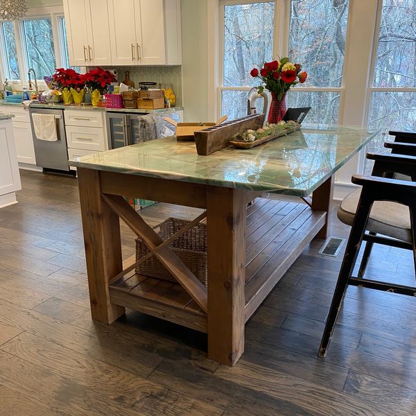 Detail of the new custom cedar table, built in house with matching quartzite countertop.