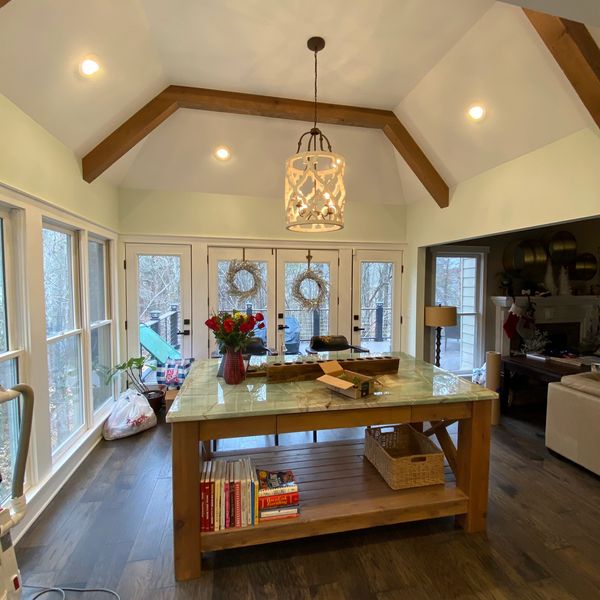 4' bump out addition to space, all glass doors, vaulted ceilings with cedar beams, custom cedar table (with pullout doggie bowls!)