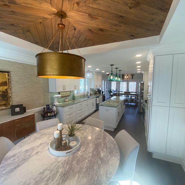 Squared up tray ceiling with distressed pine tongue and groove chevron pattern.